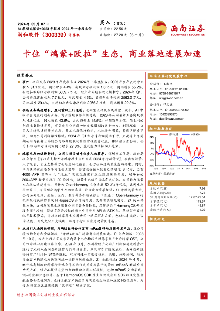 西南证券:润和软件(300339)-2023年报及2024年一季报点评:卡位“鸿蒙+欧拉”生态,商业落地进展加速.pdf