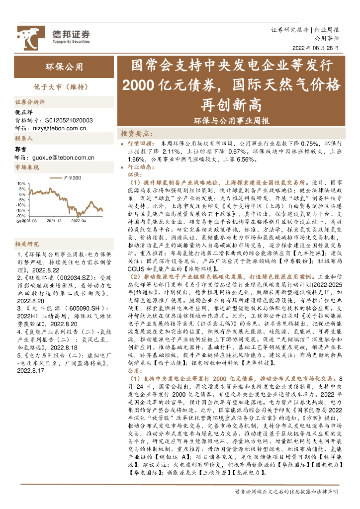 德邦证券:环保与公用事业周报:国常会支持中央发电企业等发行2000亿元债券,国际天然气价格再创新高.pdf