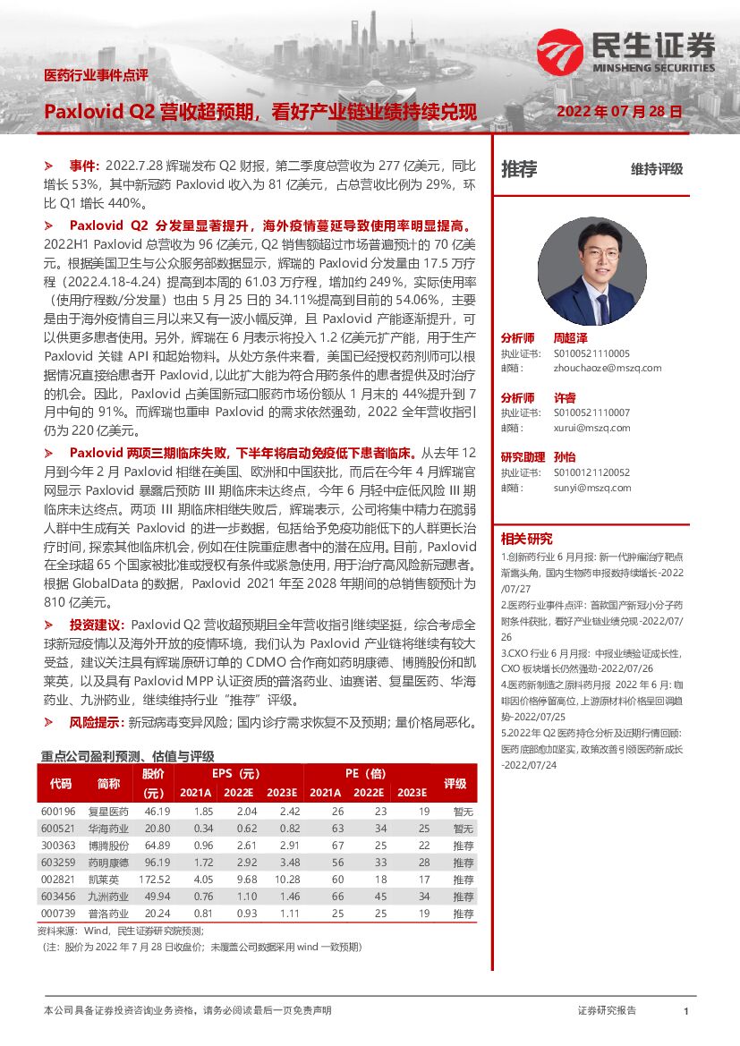 民生证券:医药行业事件点评:Paxlovid Q2营收超预期,看好产业链业绩持续兑现.pdf