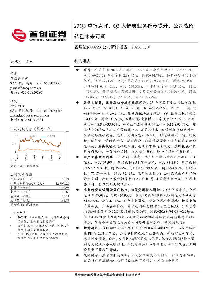 首创证券:福瑞达(600223)-23Q3季报点评:Q3大健康业务稳步提升,公司战略转型未来可期.pdf