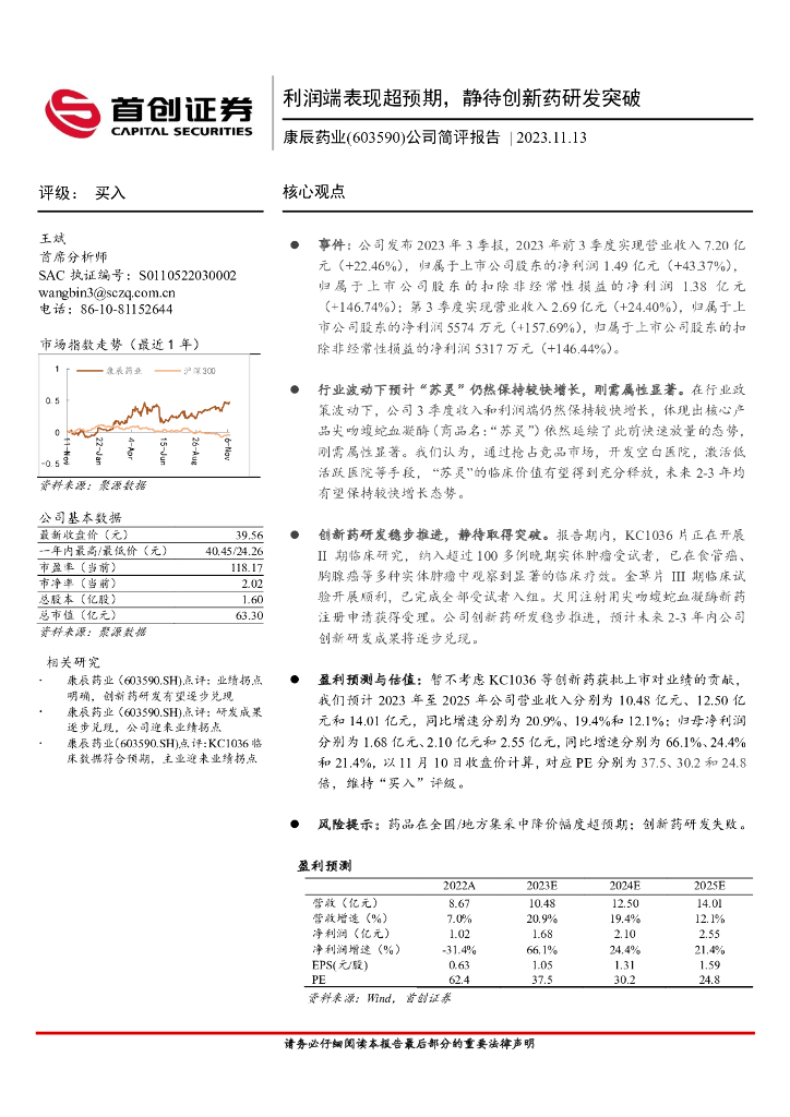 首创证券:康辰药业(603590)-公司简评报告:利润端表现超预期,静待创新药研发突破.pdf