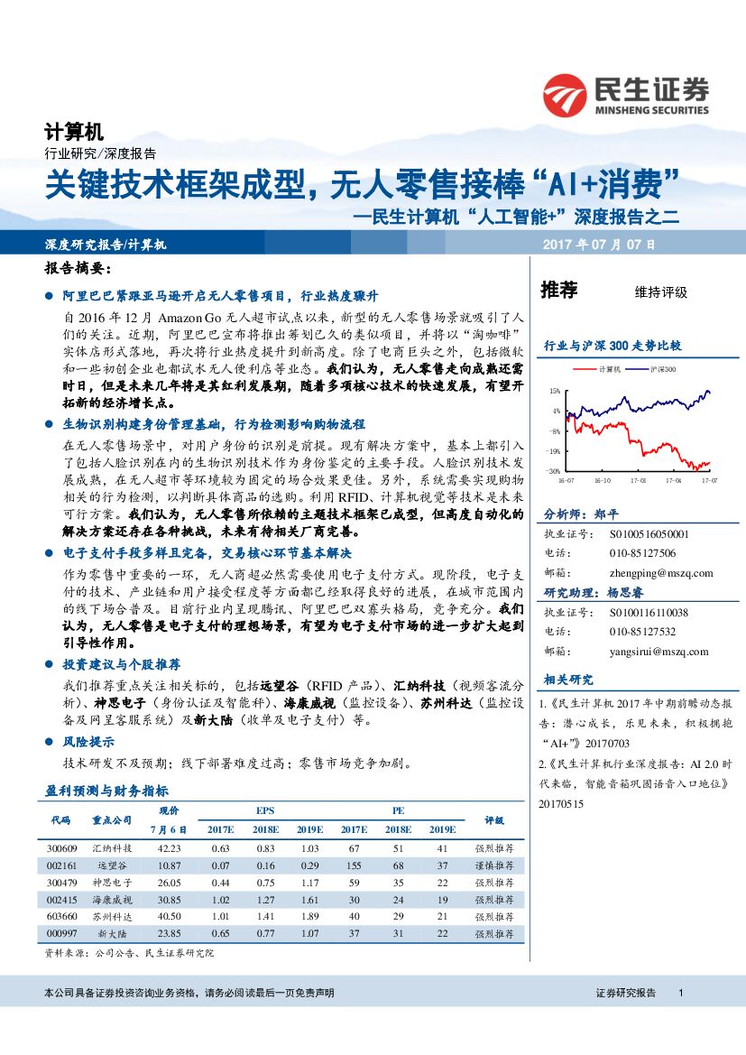 民生证券:民生计算机“人工智能+”深度报告之二:关键技术框架成型,无人零售接棒“AI+消费”.pdf