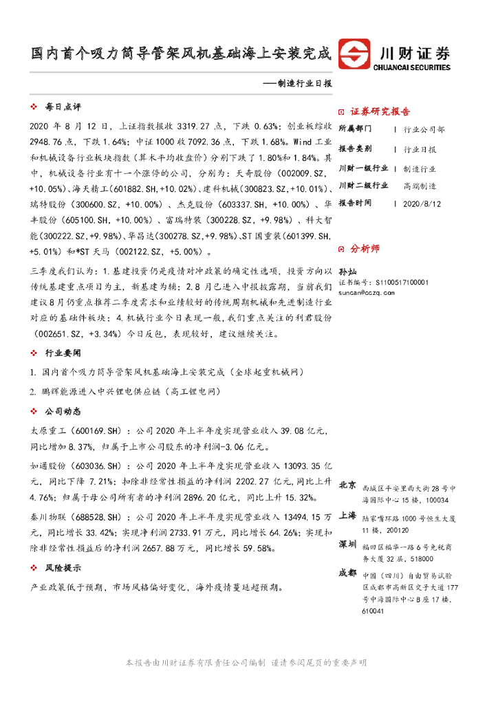 川财证券:制造行业日报:国内首个吸力筒导管架风机基础海上安装完成.pdf