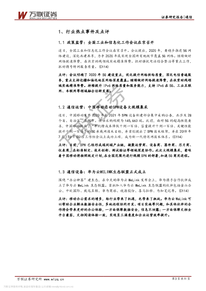 万联证券:通信行业周观点:中移启动SPN设备集采,华为云WeLink联盟成立.pdf
