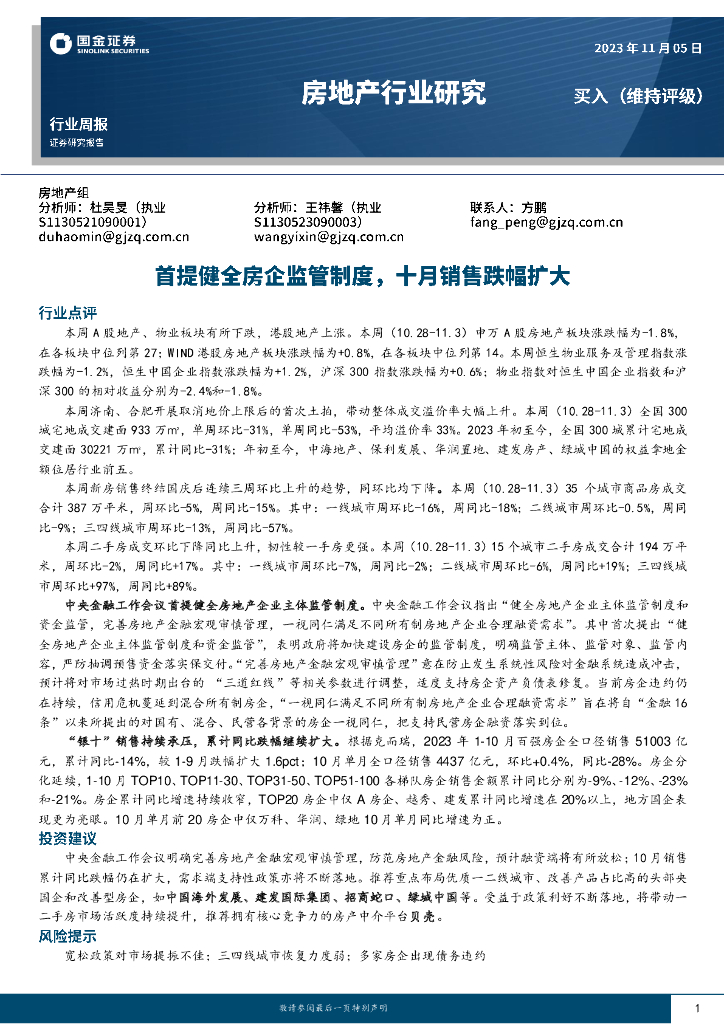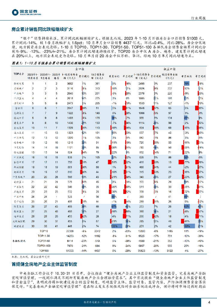 国金证券:房地产行业研究:首提健全房企监管制度,十月销售跌幅扩大.pdf