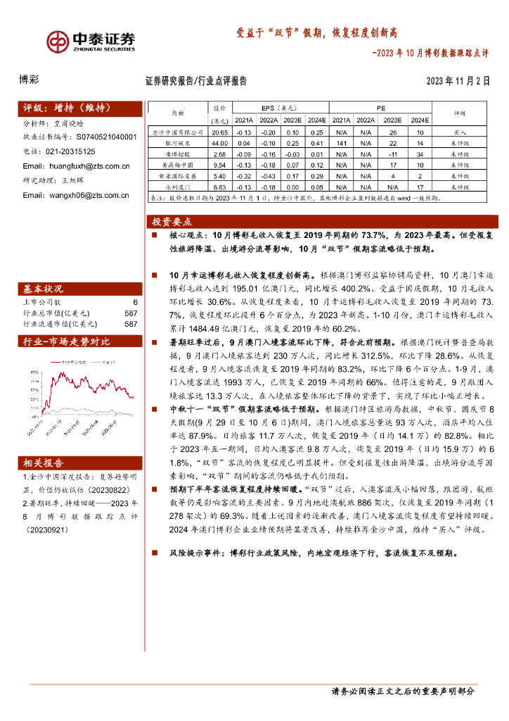 中泰证券:2023年10月博彩数据跟踪点评:受益于“双节”假期,恢复程度创新高.pdf