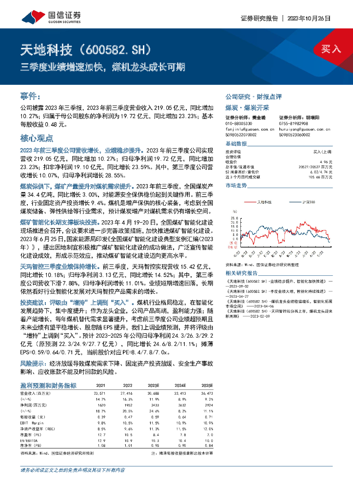 国信证券:天地科技(600582)-三季度业绩增速加快,煤机龙头成长可期.pdf