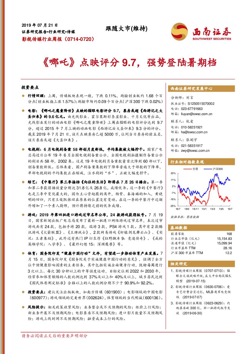 西南证券:影视传媒行业周报:《哪吒》点映评分9.7,强势登陆暑期档.pdf