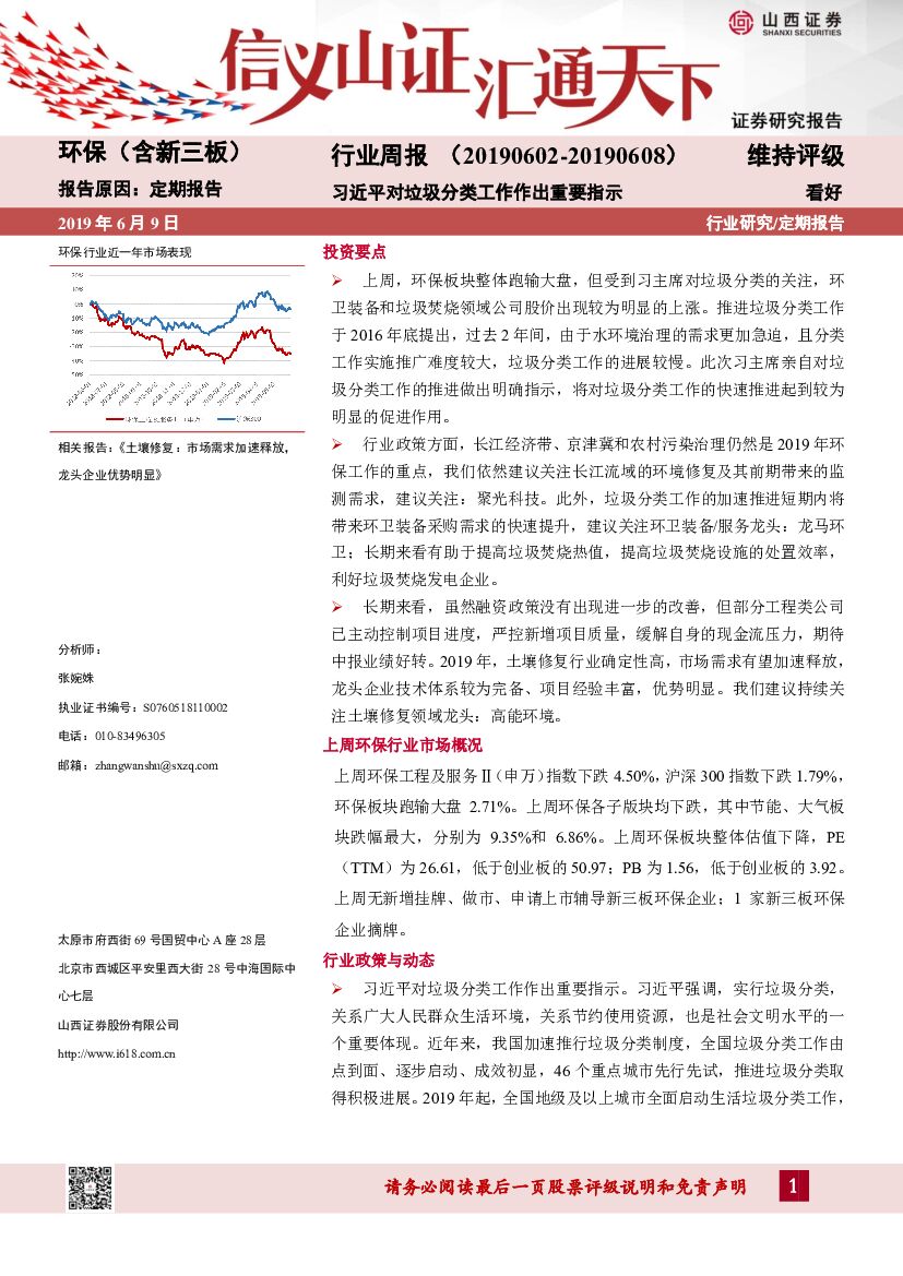 山西证券:环保(含新三板)行业周报:习近平对垃圾分类工作作出重要指示.pdf