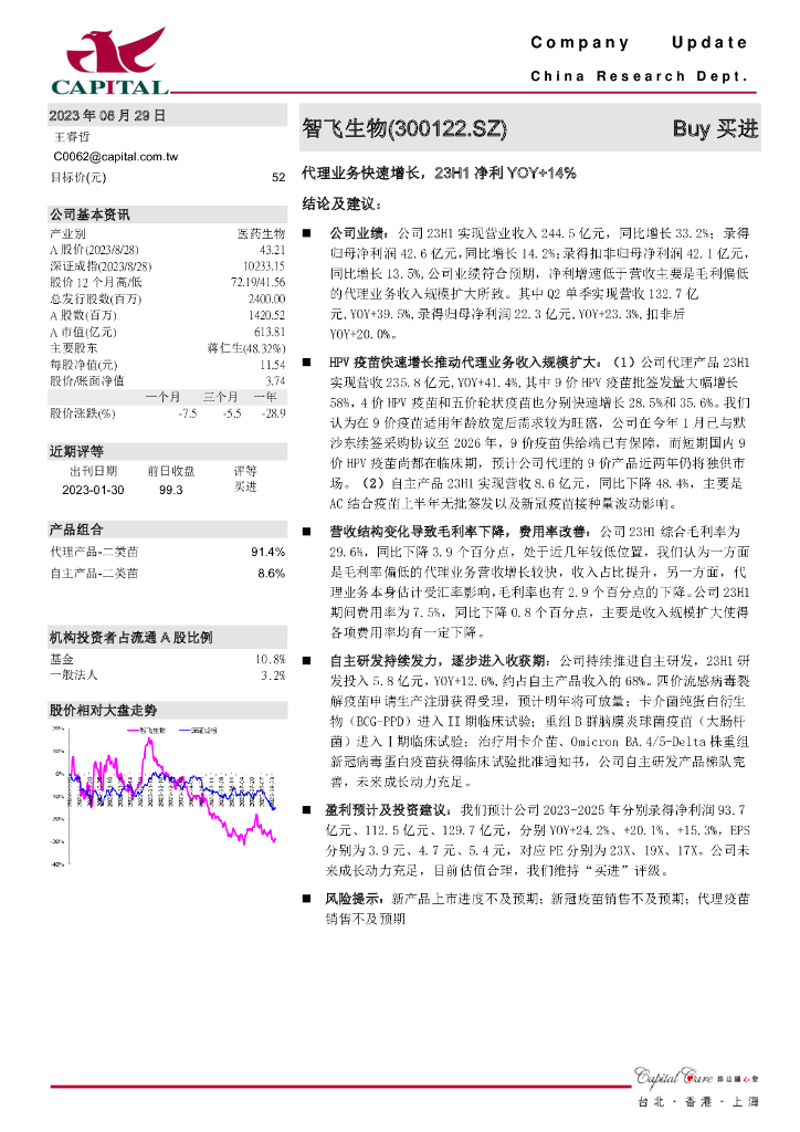 群益证券:智飞生物(300122)-代理业务快速增长,23H1净利YOY+14%.pdf