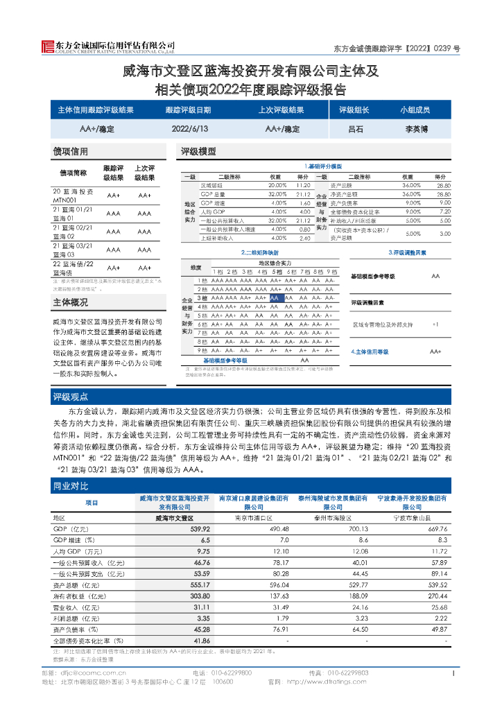 东方金诚:威海市文登区蓝海投资开发有限公司主体及相关债项2022年度跟踪评级报告.pdf