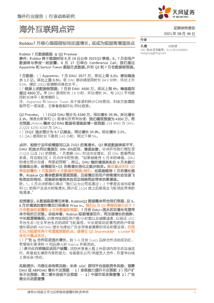 天风证券:海外互联网点评:Roblox7月核心跟踪指标均加速增长,或成为短期高增速拐点.pdf
