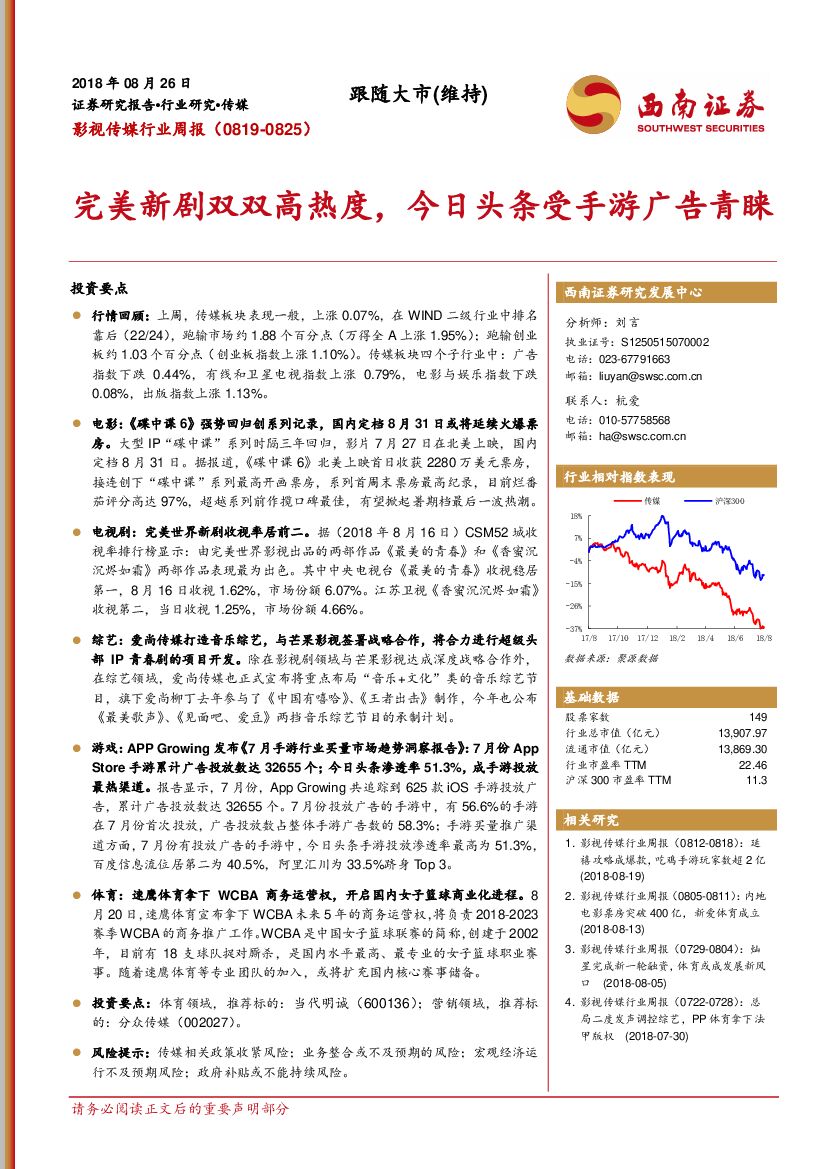 西南证券:影视传媒行业周报:完美新剧双双高热度,今日头条受手游广告青睐.pdf