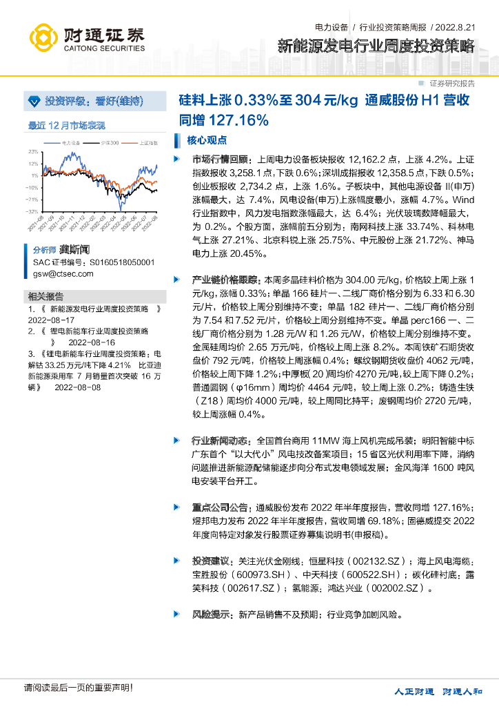 财通证券:新能源发电行业周度投资策略:硅料上涨0.33%至304元/kg 通威股份H1营收同增127.16%.pdf