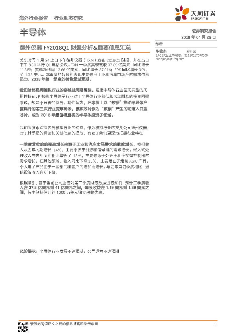 天风证券:半导体行业动态研究:德州仪器FY2018Q1财报分析&重要信息汇总.pdf