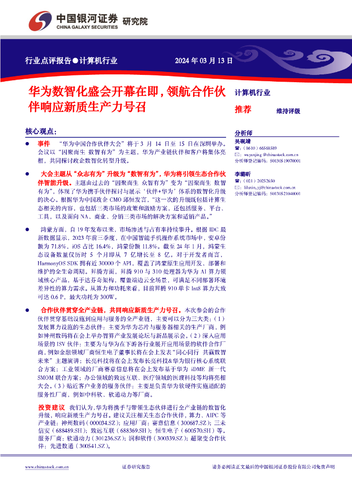 中国银河:计算机行业行业点评报告:华为数智化盛会开幕在即,领航合作伙伴响应新质生产力号召.pdf