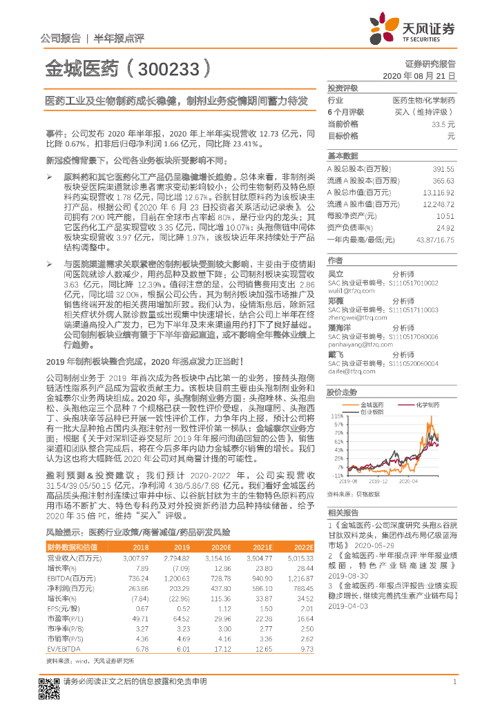 天风证券:金城医药(300233)-医药工业及生物制药成长稳健,制剂业务疫情期间蓄力待发.pdf