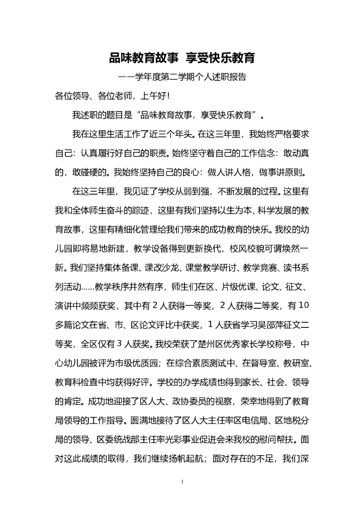 品味教育故事 享受快乐教育 ——学年度第二学期个人述职报告.doc