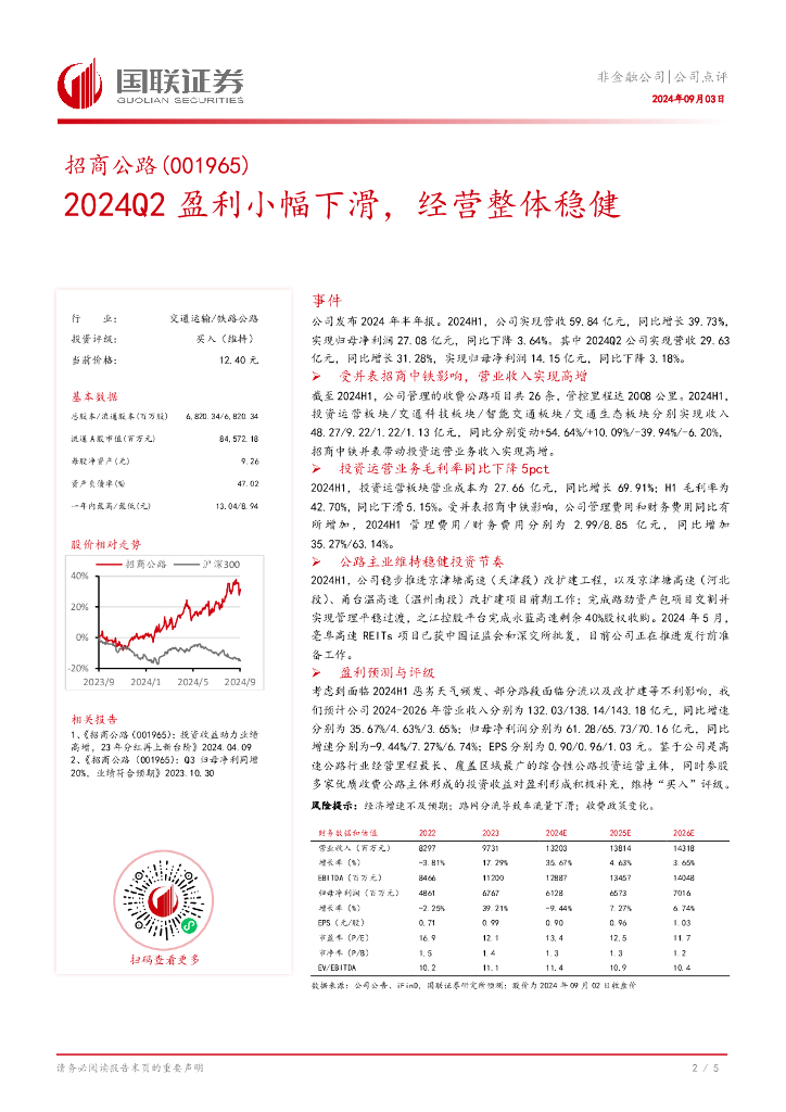 国联证券:招商公路(001965)-2024Q2盈利小幅下滑,经营整体稳健.pdf
