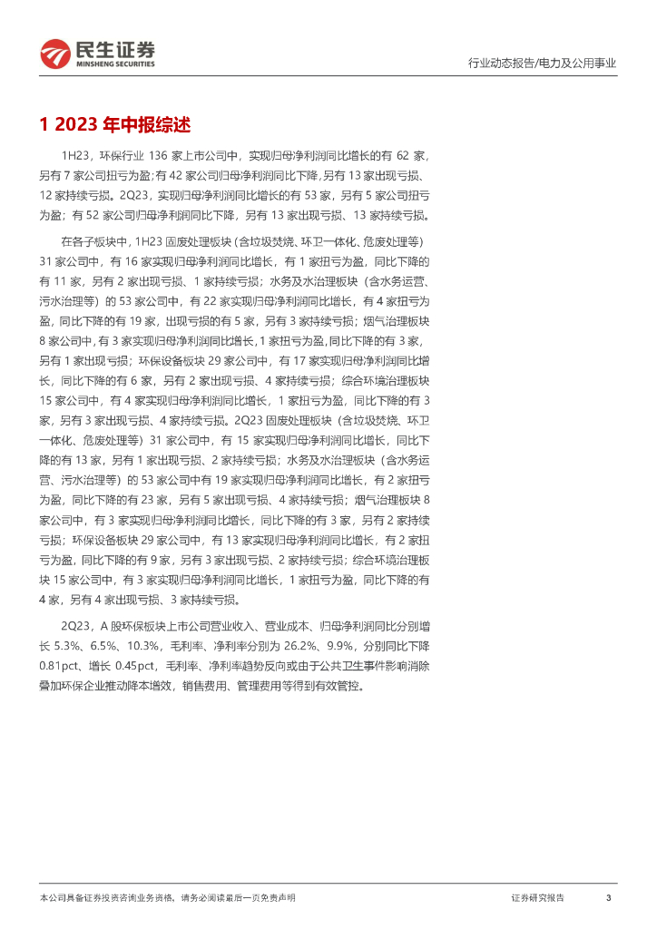 民生证券:环保行业2023年半年报业绩综述:固废、水务运营稳健,设备成长可期.pdf