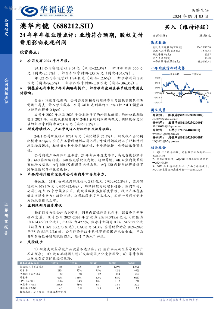 华福证券:澳华内镜(688212)-24年半年报业绩点评:业绩符合预期,股权支付费用影响表观利润.pdf