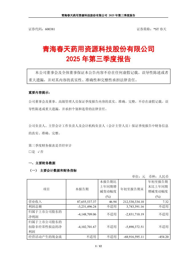 600381-*ST春天:青海春天2025年第三季度报告.pdf