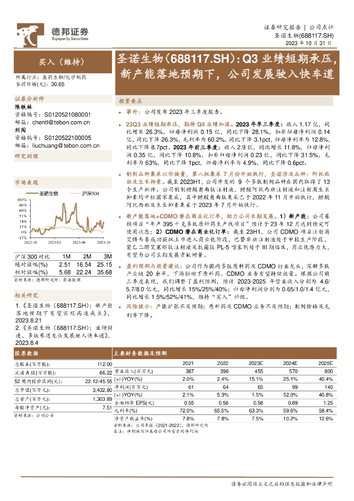 德邦证券:圣诺生物(688117)-Q3业绩短期承压,新产能落地预期下,公司发展驶入快车道.pdf