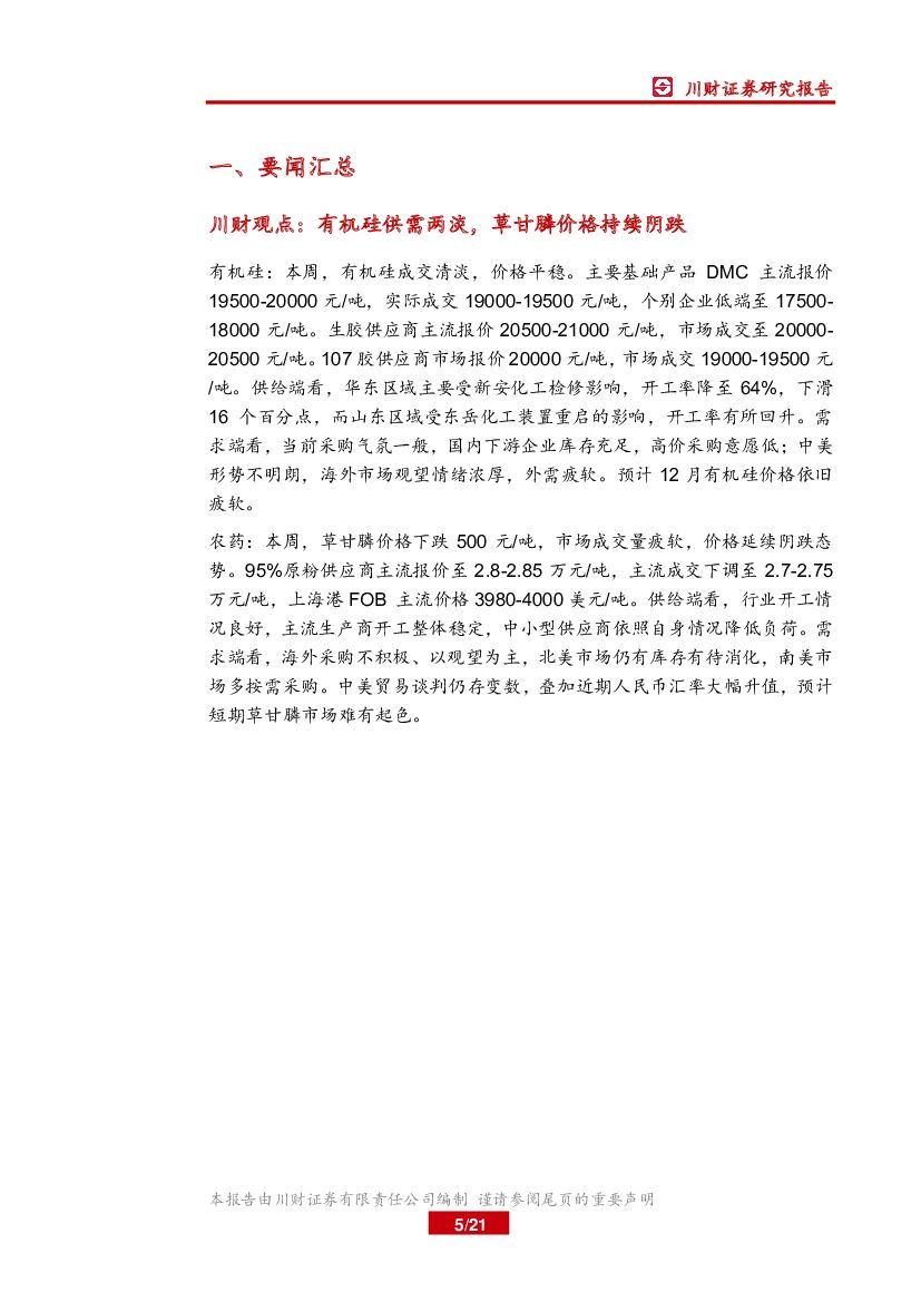 川财证券:基础化工行业周报:有机硅供需两淡,草甘膦价格持续阴跌.pdf