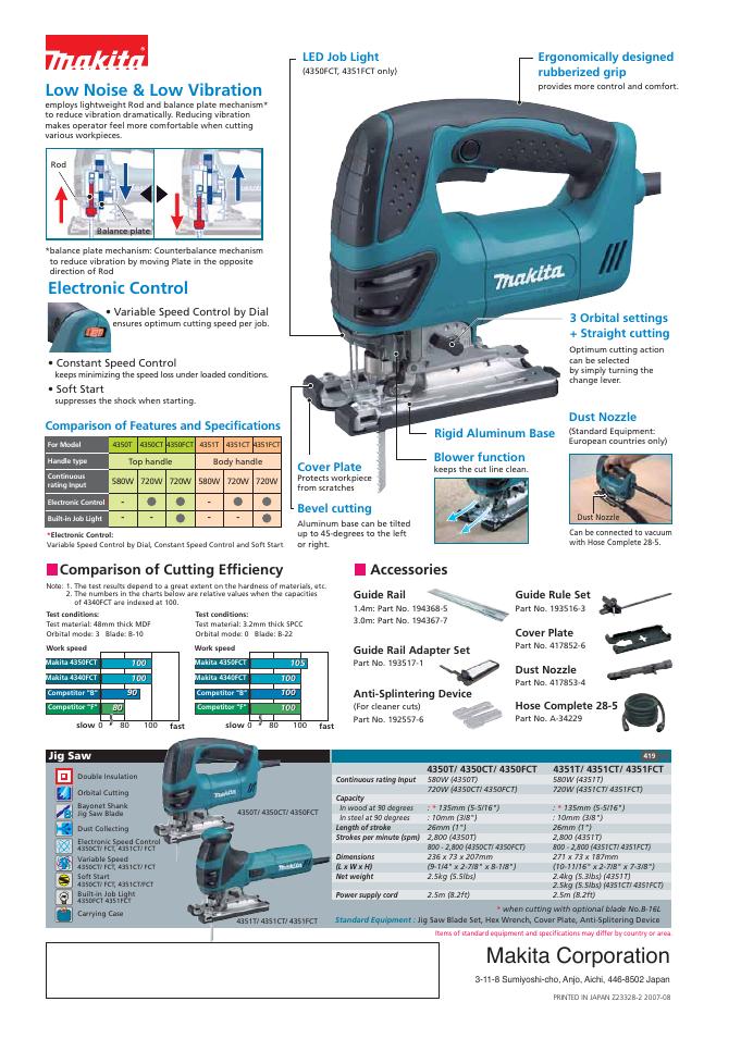 makita Jig Saw 4350T, 4350CT, 4350FCT 4351T, 4351CT, 4351FCT HIGH QUALITY & RELIABILITY by Superior Maneuverability 数据手册.pdf