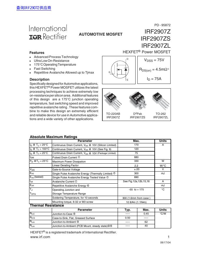 International IOR Rectifier IRF2907Z IRF2907ZS IRF2907ZL 数据手册.pdf