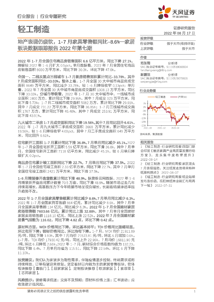 天风证券:家居板块数据跟踪报告2022年第七期:地产表现仍疲软,1-7月家具零售额同比-8.6%.pdf