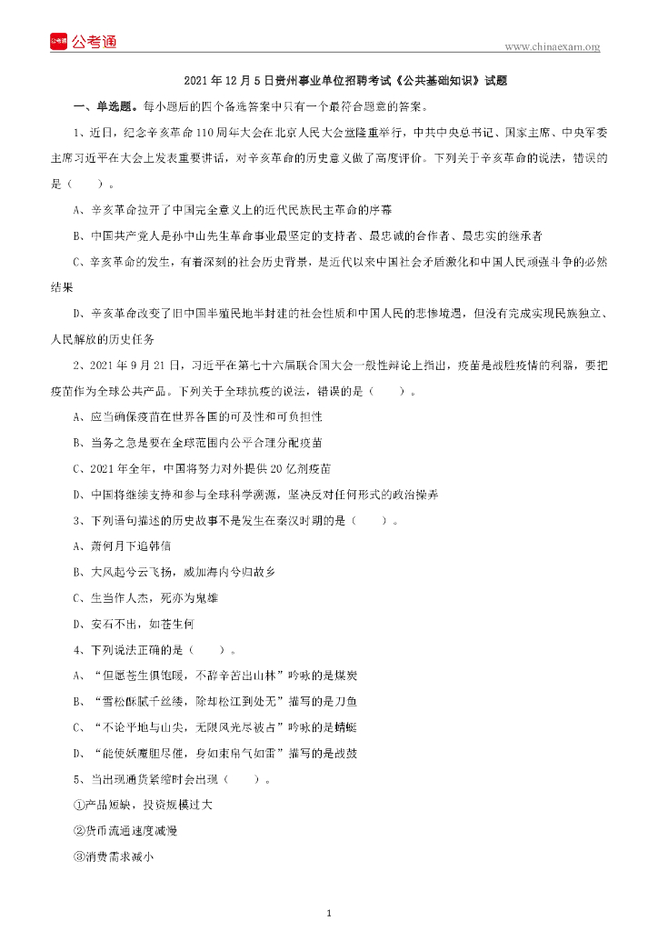 2021年12月5日贵州事业单位招聘考试《公共基础知识》试题.pdf