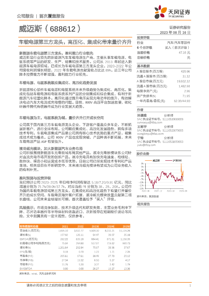 天风证券:威迈斯(688612)-车载电源第三方龙头,高压化、集成化带来量价齐升.pdf