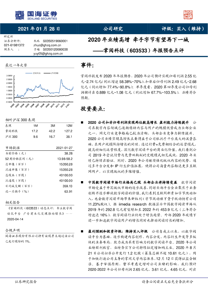 国海证券:掌阅科技(603533)-年报预告点评:2020年业绩高增 牵手字节有望再下一城.pdf