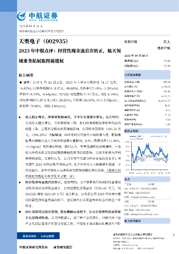 中航证券:天奥电子(002935)-2023年中报点评:经营性现金流首次转正,航天领域业务拓展取得新进展.pdf