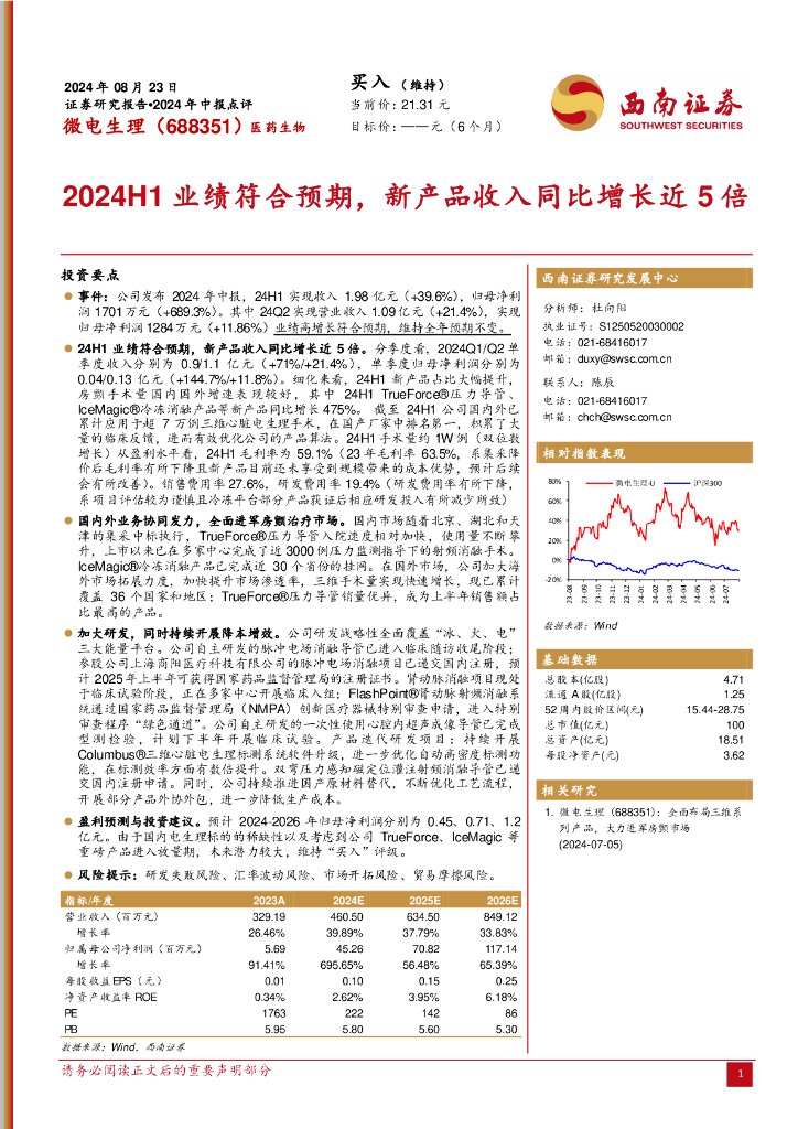 西南证券:微电生理(688351)-2024年中报点评:2024H1业绩符合预期,新产品收入同比增长近5倍.pdf