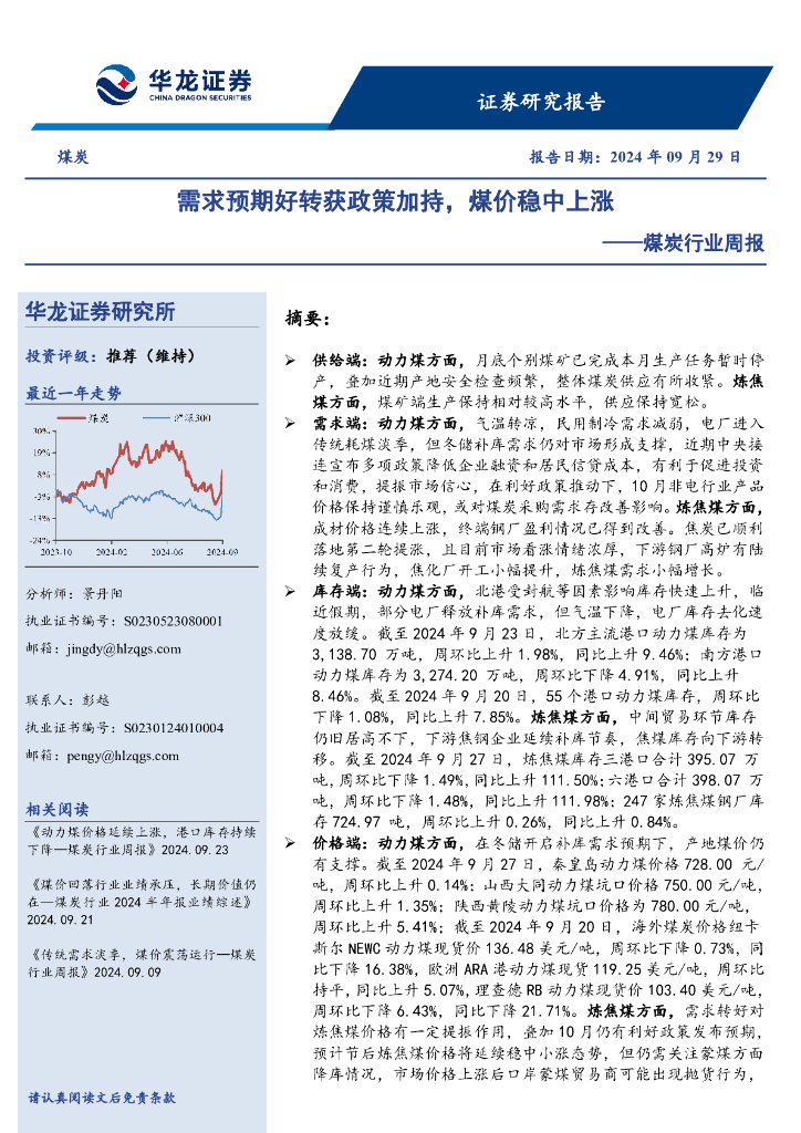 华龙证券:煤炭行业周报:需求预期好转获政策加持,煤价稳中上涨.pdf