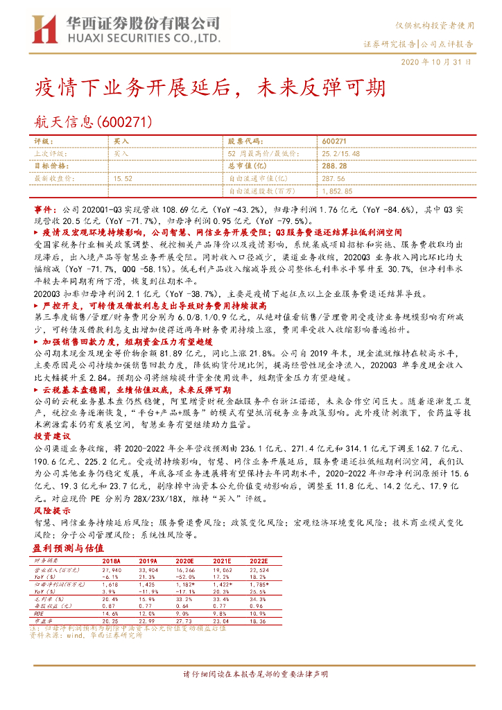 华西证券:航天信息(600271)-疫情下业务开展延后,未来反弹可期.pdf