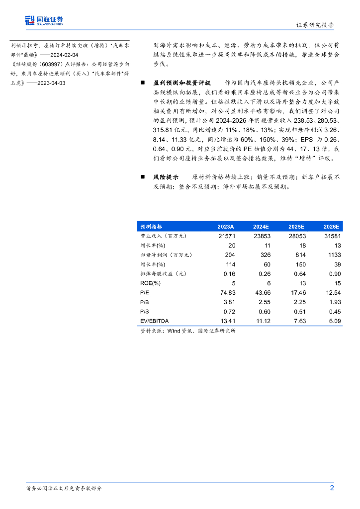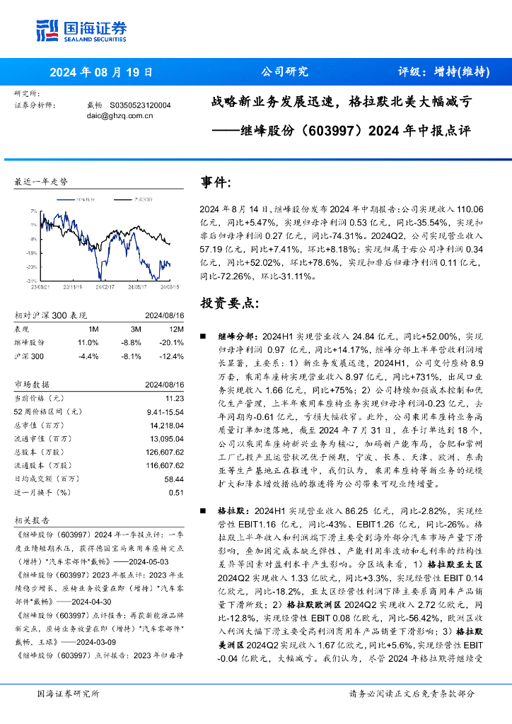 国海证券:继峰股份(603997)-2024年中报点评:战略新业务发展迅速,格拉默北美大幅减亏.pdf
