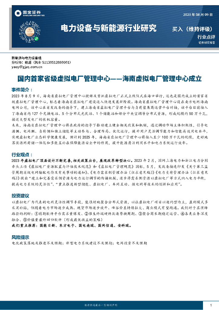 国金证券:电力设备与新能源行业研究:国内首家省级虚拟电厂管理中心-海南虚拟电厂管理中心成立.pdf