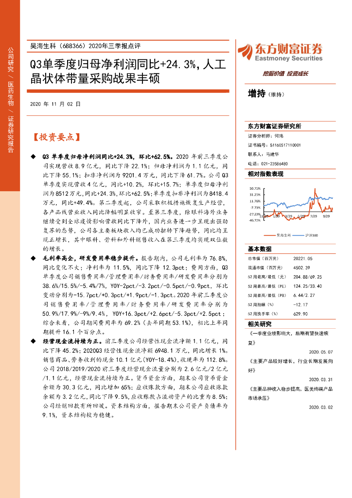 东方财富证券:昊海生科(688366)-2020年三季报点评:Q3单季度归母净利润同比+24.3%,人工晶状体带量采购战果丰硕.pdf