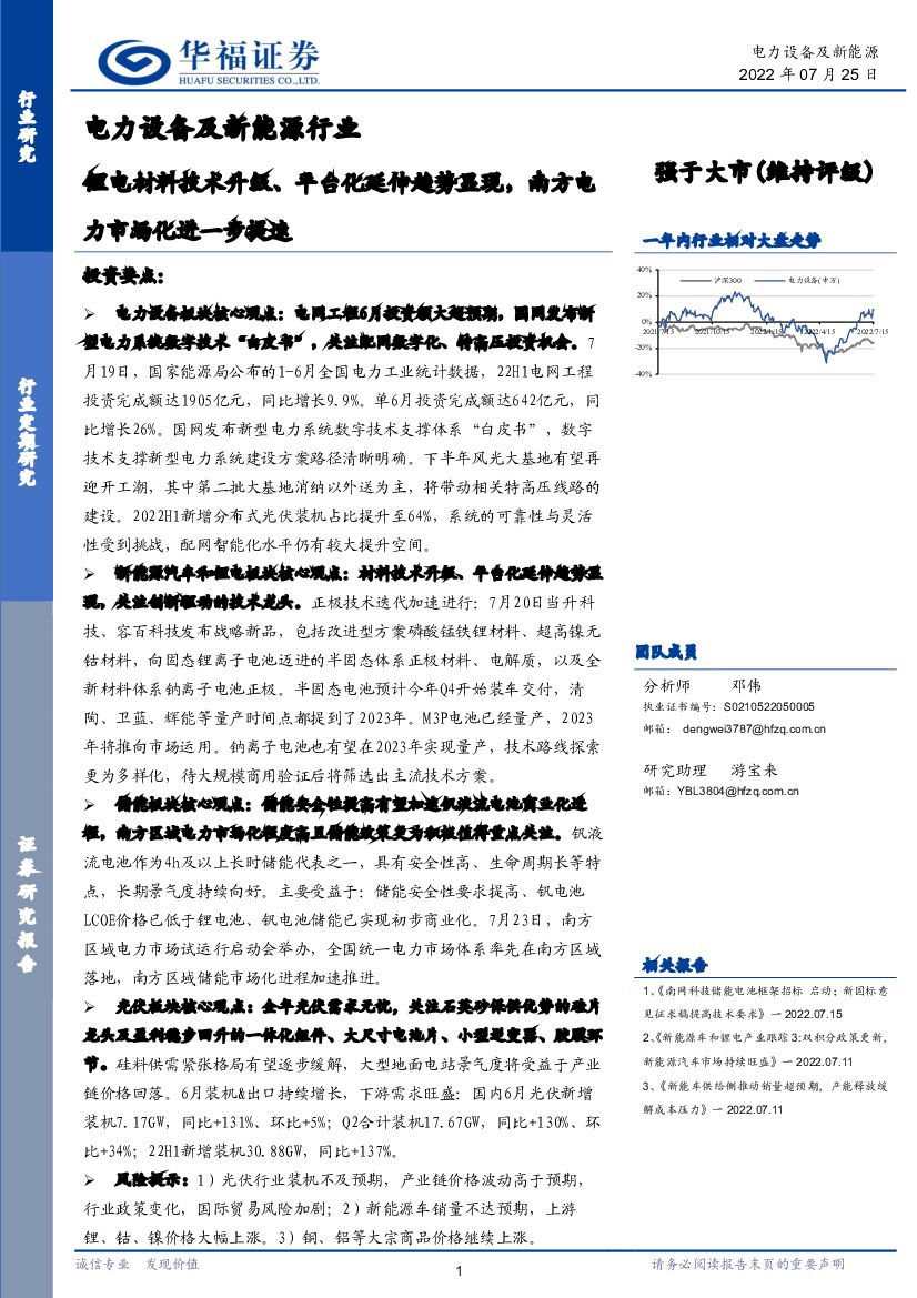 华福证券:电力设备及新能源行业:锂电材料技术升级、平台化延伸趋势显现,南方电力市场化进一步提速.pdf