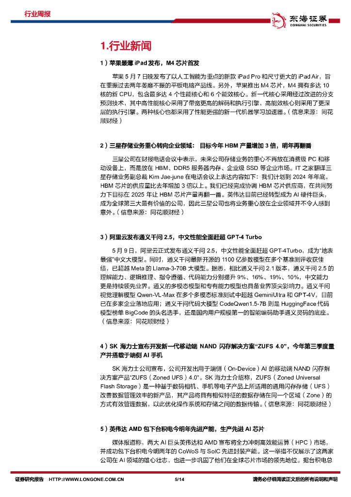 东海证券:电子行业周报:存储合约涨价预期上调,苹果发布M4芯片加码AIPC.pdf