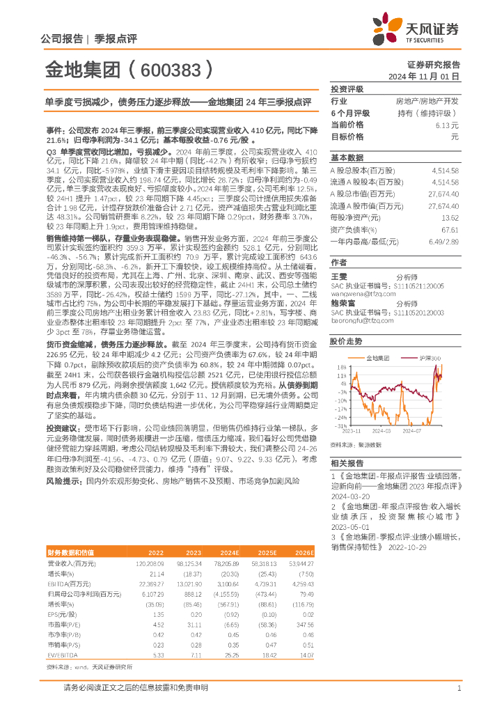 天风证券:金地集团24年三季报点评:单季度亏损减少,债务压力逐步释放.pdf
