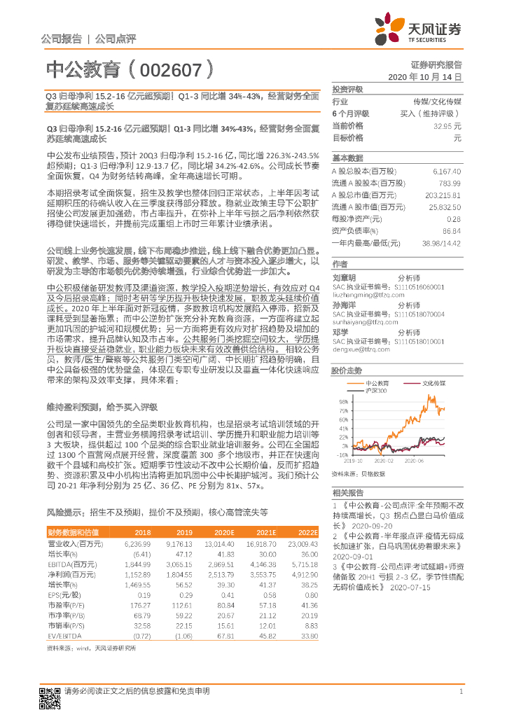 天风证券:中公教育(002607)-Q3归母净利15.2-16亿元超预期!Q1-3同比增34%-43%,经营财务全面复苏延续高速成长.pdf