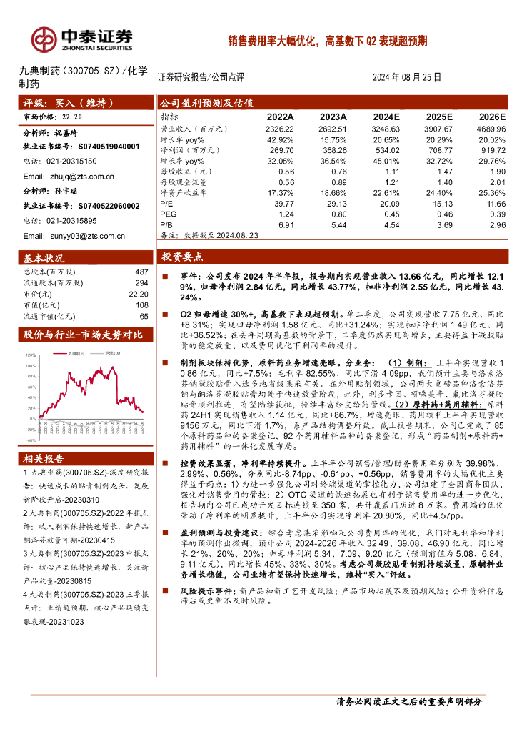 中泰证券:九典制药(300705)-销售费用率大幅优化,高基数下Q2表现超预期.pdf