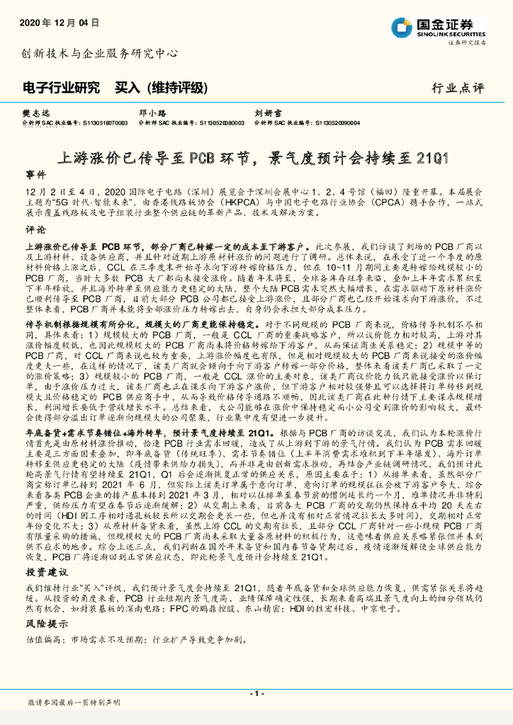 国金证券:电子行业研究:上游涨价已传导至PCB环节,景气度预计会持续至21Q1.pdf
