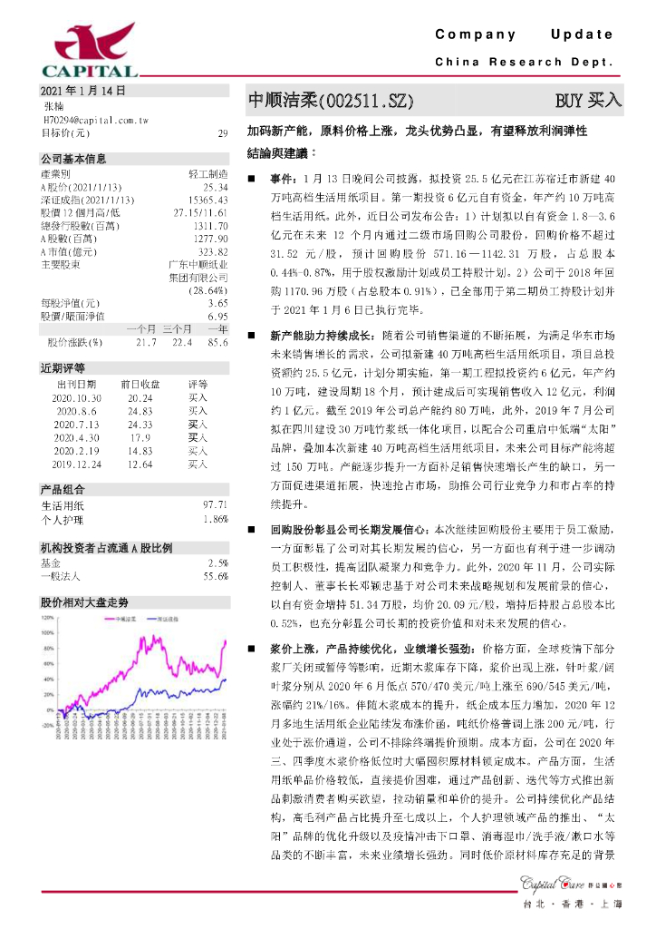 群益证券:中顺洁柔(002511)-加码新产能,原料价格上涨,龙头优势凸显,有望释放利润弹性.pdf