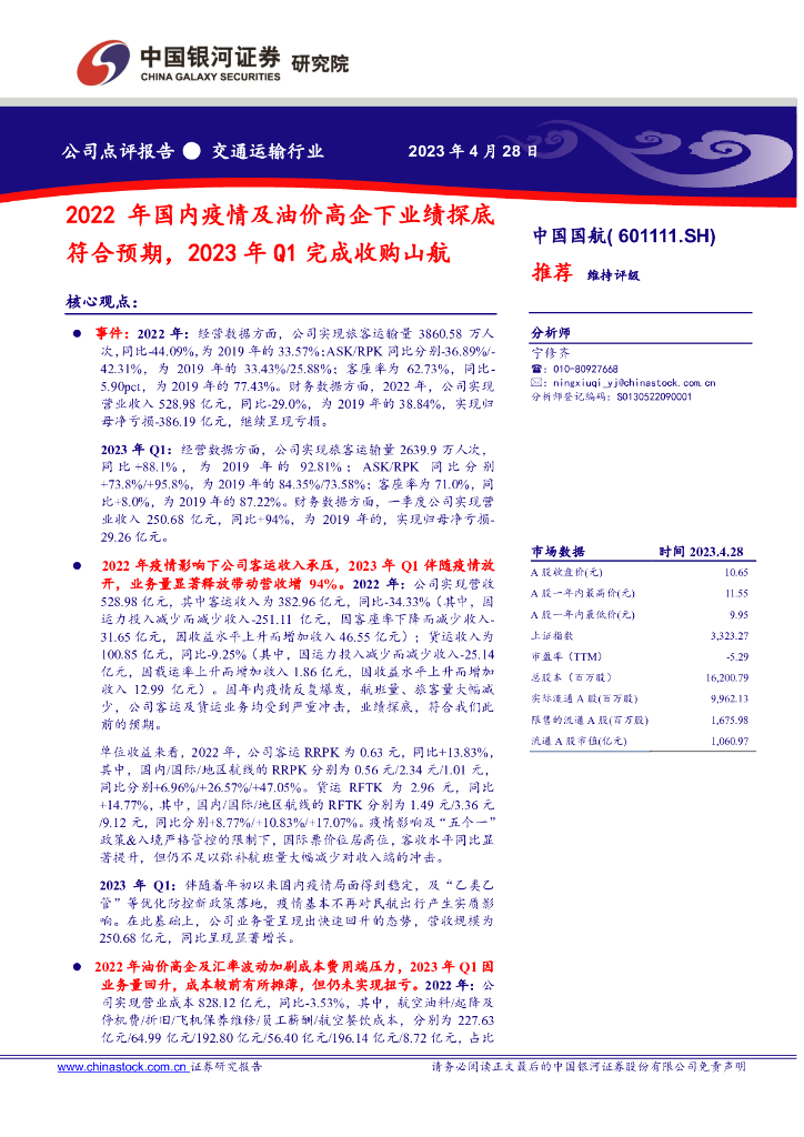中国银河:中国国航(601111)-2022年国内疫情及油价高企下业绩探底符合预期,2023年Q1完成收购山航.pdf