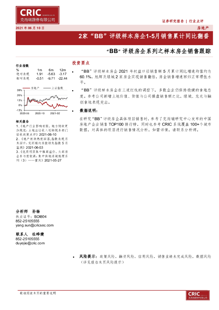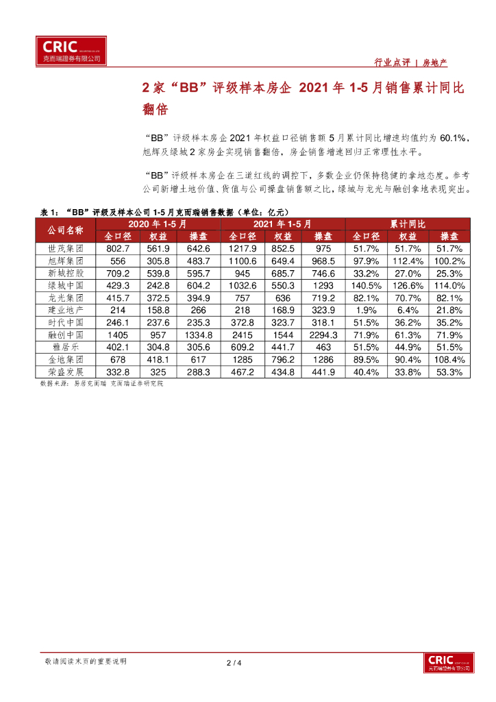 克而瑞证券:“BB”评级房企系列之样本房企销售跟踪:2家“BB”评级样本房企1-5月销售累计同比翻番.pdf